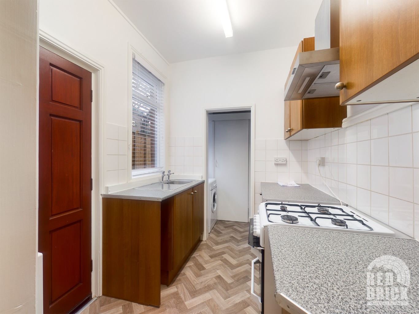 The kitchen leads off the 2nd reception room, with cooker with gas hob, washing machine and space for a fridge freezer. Door leading out into fully enclosed patioed garden.