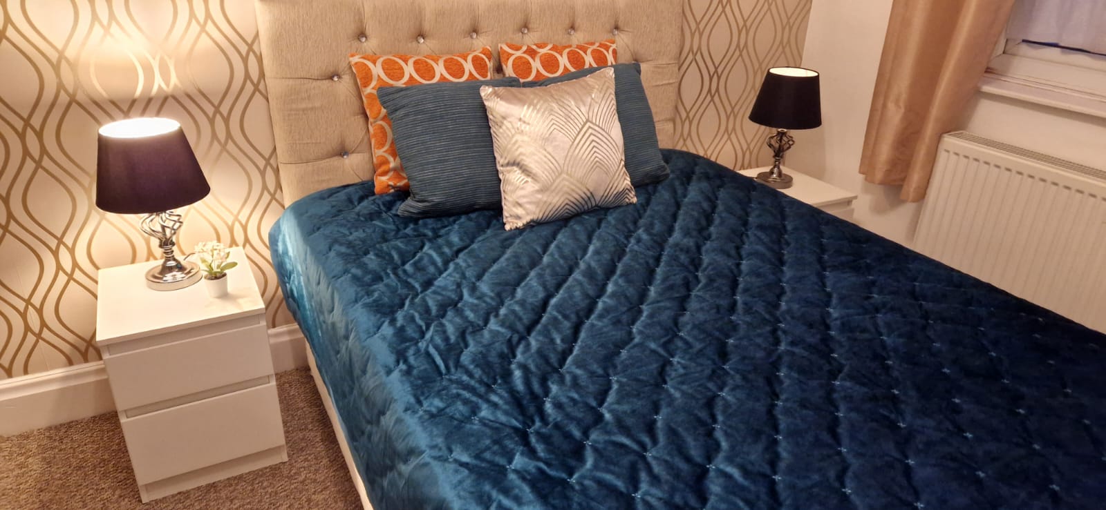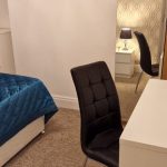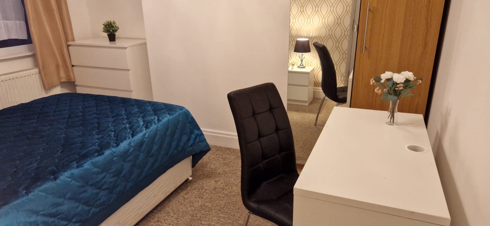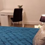 The room is located on the ground floor with double bed, shelves, wardrobe, drawers, desk, chair & bedside tables.