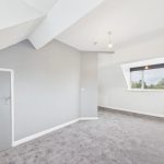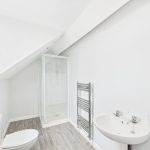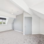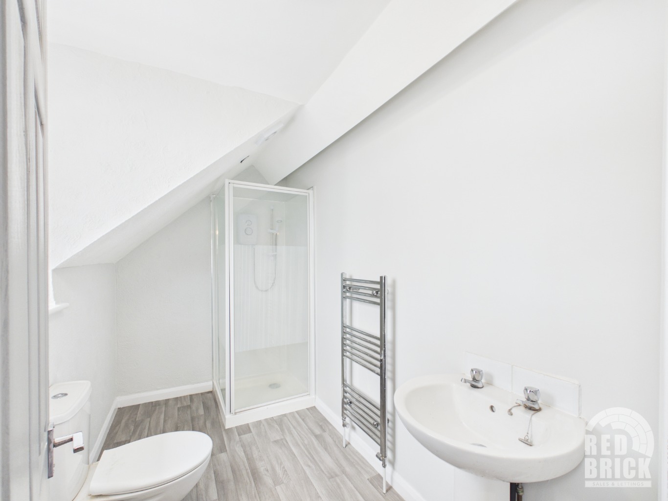 Stairs lead up to a large lounge with storage, door to double bedroom and bathroom with shower cubicle.
