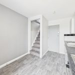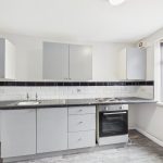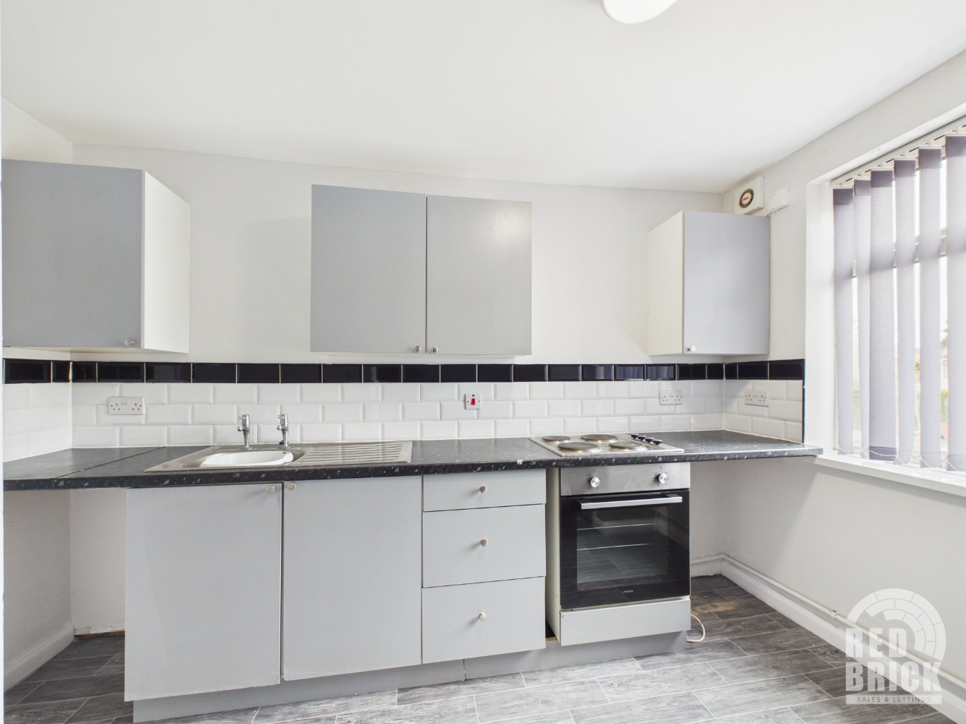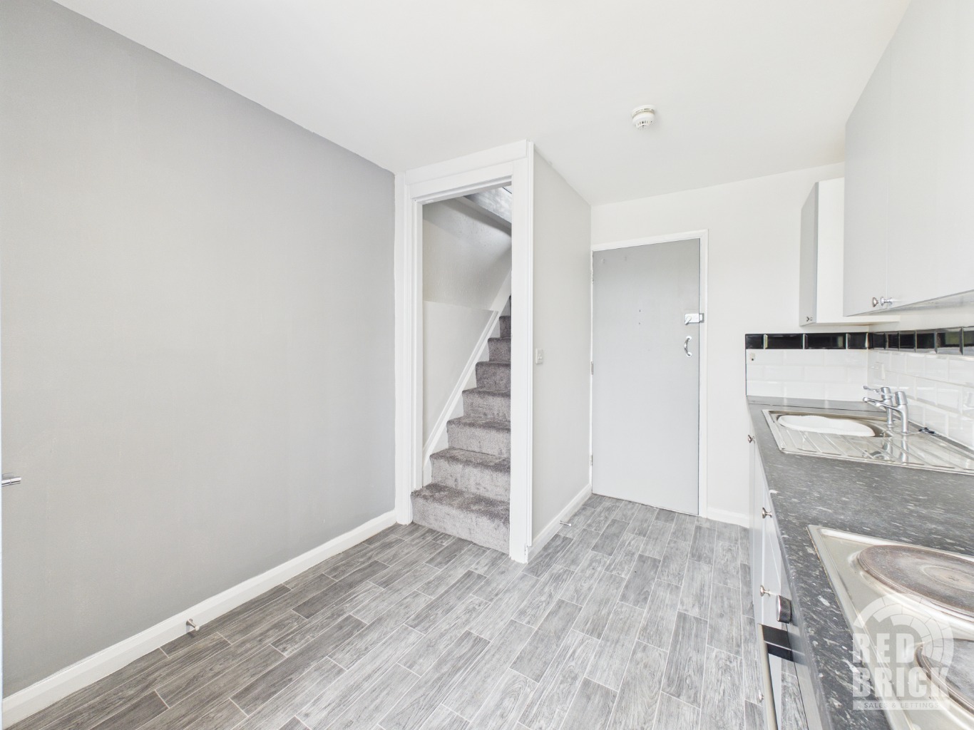 The property is within a building with 2 flats, communal stairs lead up to entrance into kitchen with electric oven & hob, space for white goods and table & chairs.